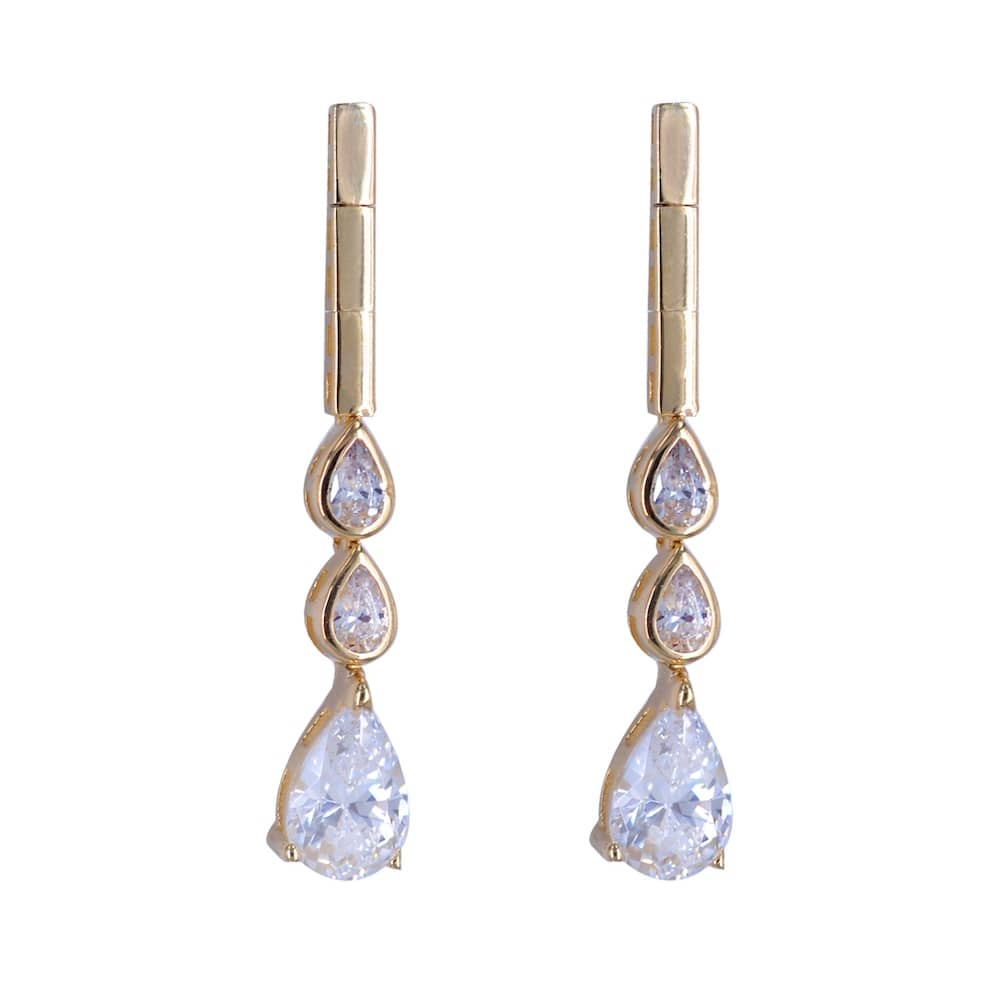 Χρυσά σκουλαρίκια κρεμαστά 14 Καρατίων διακοσμημένο από λουστρέ ορθογώνια σχέδια και μία κεντρική πέτρα ζιργκόν Swarovski σε σχήμα δάκρυ που περιτρυγυρίζεται από 2 μικρότερες πέτρες ζιργκόν Swarovski.
