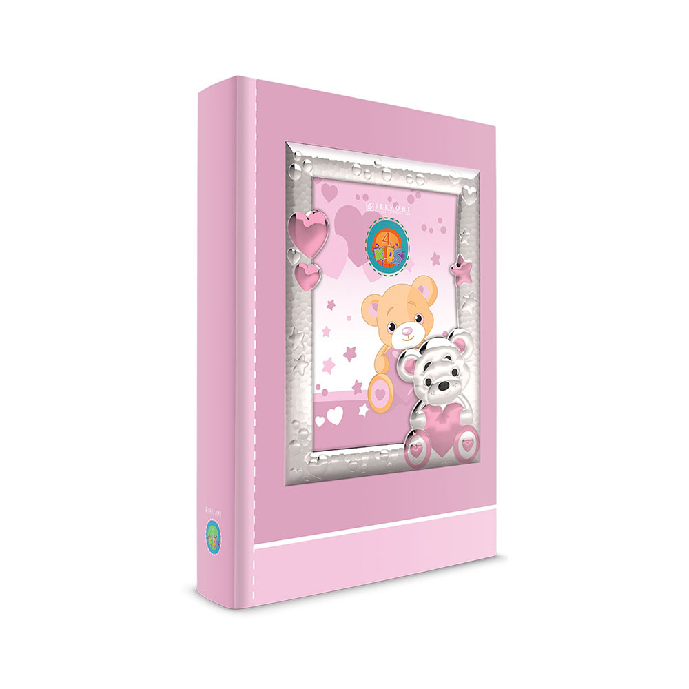 Ασημένια παιδική κορνίζα Slevori, με διακοσμητικό αρκουδάκι σε ροζ χρώμα.