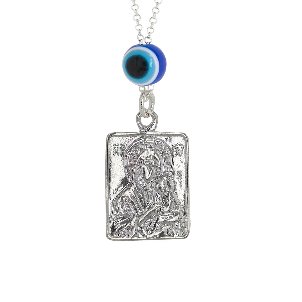 Ασημένιο φυλακτό αυτοκινήτου διπλής όψεως με τον Άγιο Χριστόφορο και την Παναγία και μπλέ χάντρα ή ματάκι