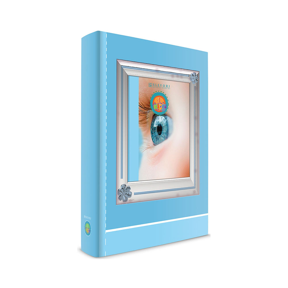 Ασημένια παιδική κορνίζα Slevori, με διακοσμητικό φιόγκο, σε σιέλ χρώμα.
