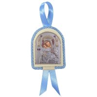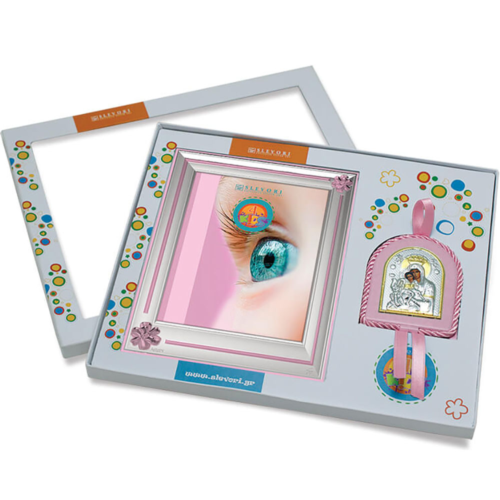 Ασημένιο παιδικό σετ 925 Φιόγκος και εικόνα κούνιας με την Παναγία Άξιον Εστί.