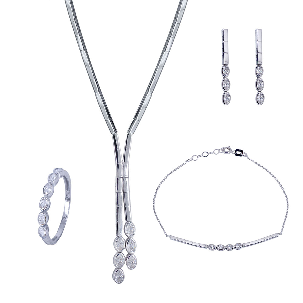 Σετ λευκόχρυσο 14 Καρατίων,  με ιδιαίτερο μοντέρνο σχέδιο με ορθογώνια στοιχεία και με πέτρες ζιργκόν Swarovski σε οβάλ σχήμα.