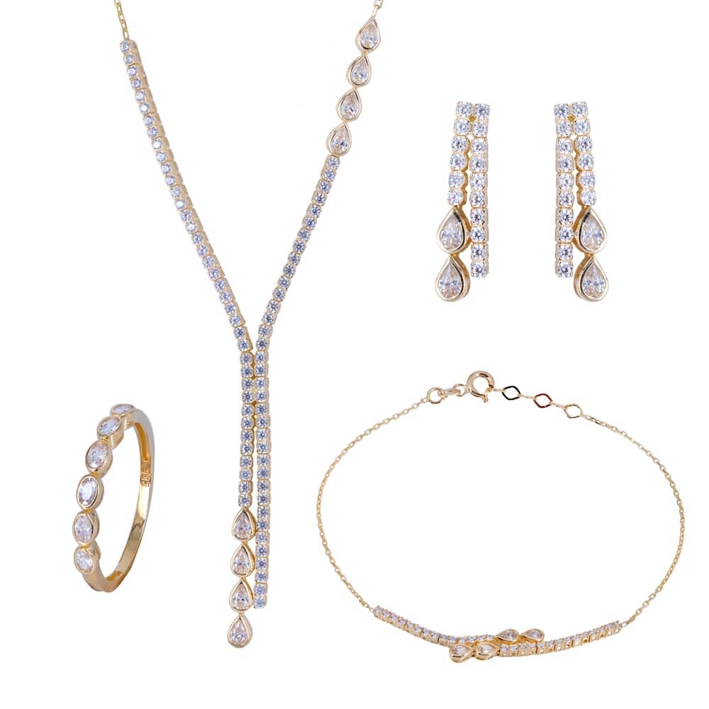 Σετ χρυσό 14 Καρατίων, με ιδιαίτερο μοντέρνο σχέδιο από μονή σειρά με ζιργκόν Swarovski με ενδιάμεσες πέτρες ζιργκόν Swarovski σε ορθογώνιο σχήμα .