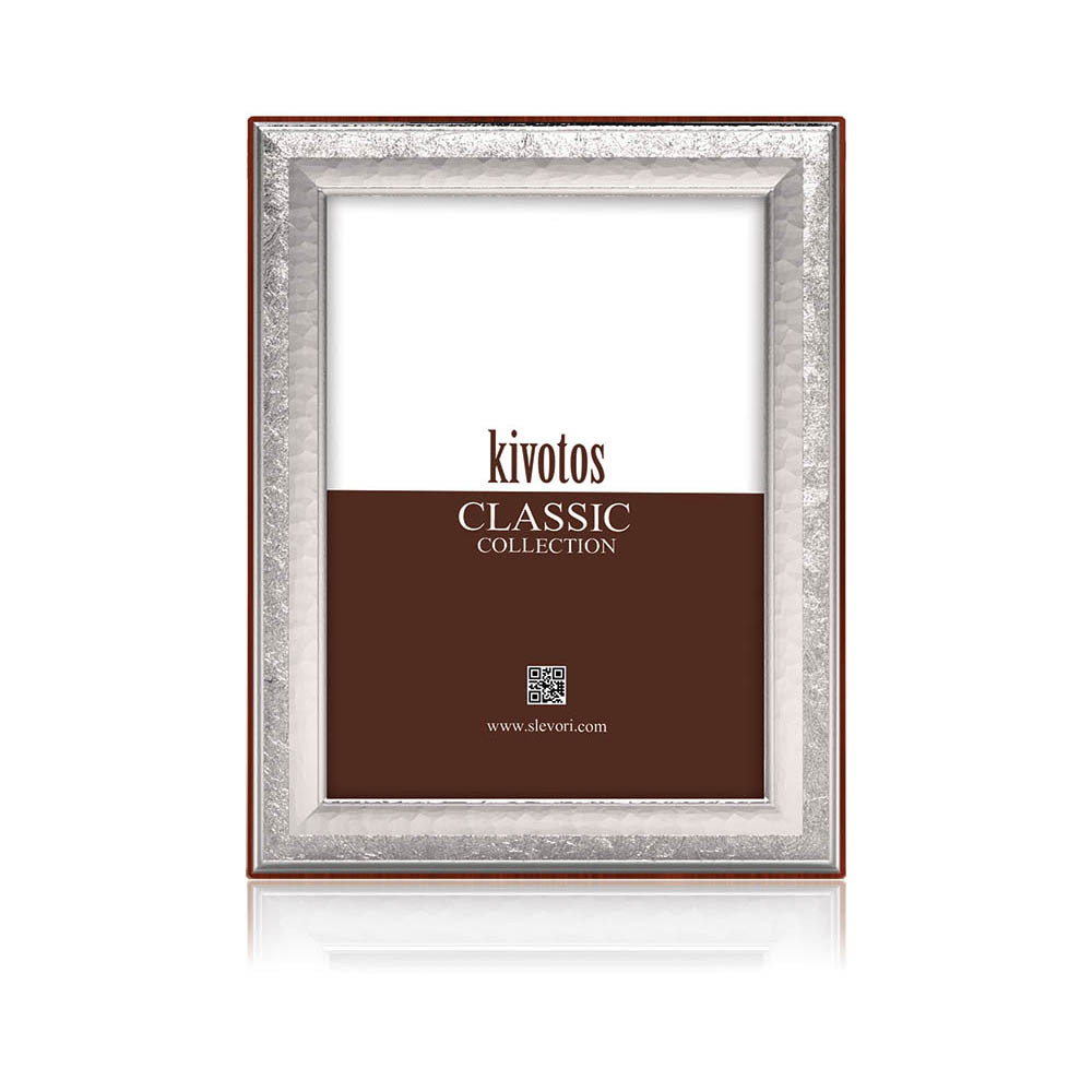 Κορνίζα από ασήμι 925, Slevori, σε ορθογώνιο σχήμα με σφυρήλατο φινίρισμα και σαγρέ και ξύλινη πλάτη σε καφέ χρώμα.