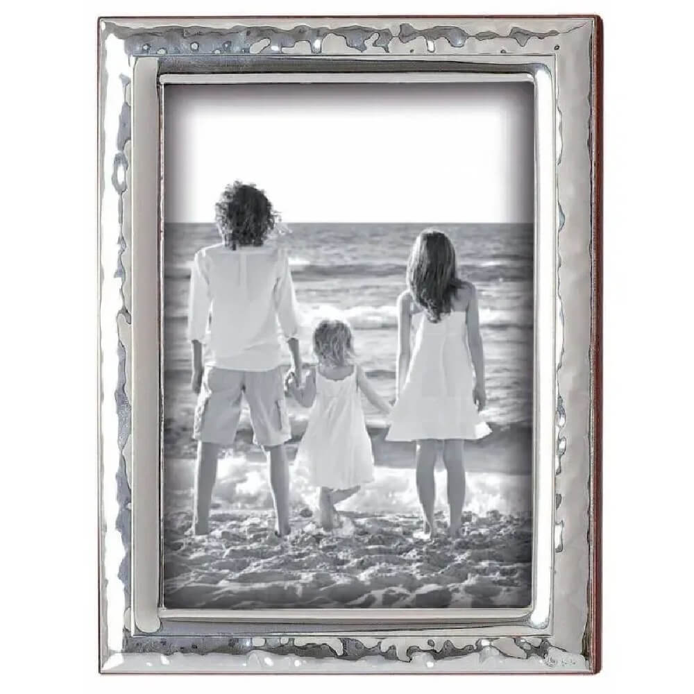 Κορνίζα από ασήμι 925, με σφυρήλατες λεπτομέρειες, συρίτι και λείο φινίρισμα. Η πλάτη είναι ξύλινη σε καφέ χρώμα.