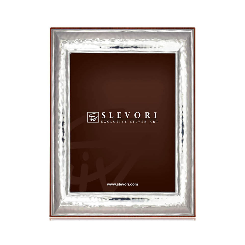 Κορνίζα από ασήμι 925, Slevori, με σφυρήλατο εφέ. Η πλάτη είναι ξύλινη σε καφέ χρώμα.