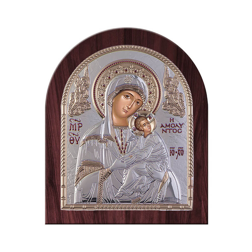 Ασημένια εκκλησιαστική εικόνα, ασύμμετρη, που απεικονίζει την Παναγία Βλαδιμίρκα.