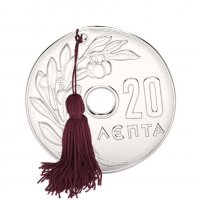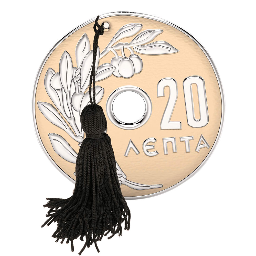 Γούρι επιτραπέζιο σε σχέδιο εικοσάρα (20 λεπτά της Δραχμής) και λευκή ξύλινη πλάτη.